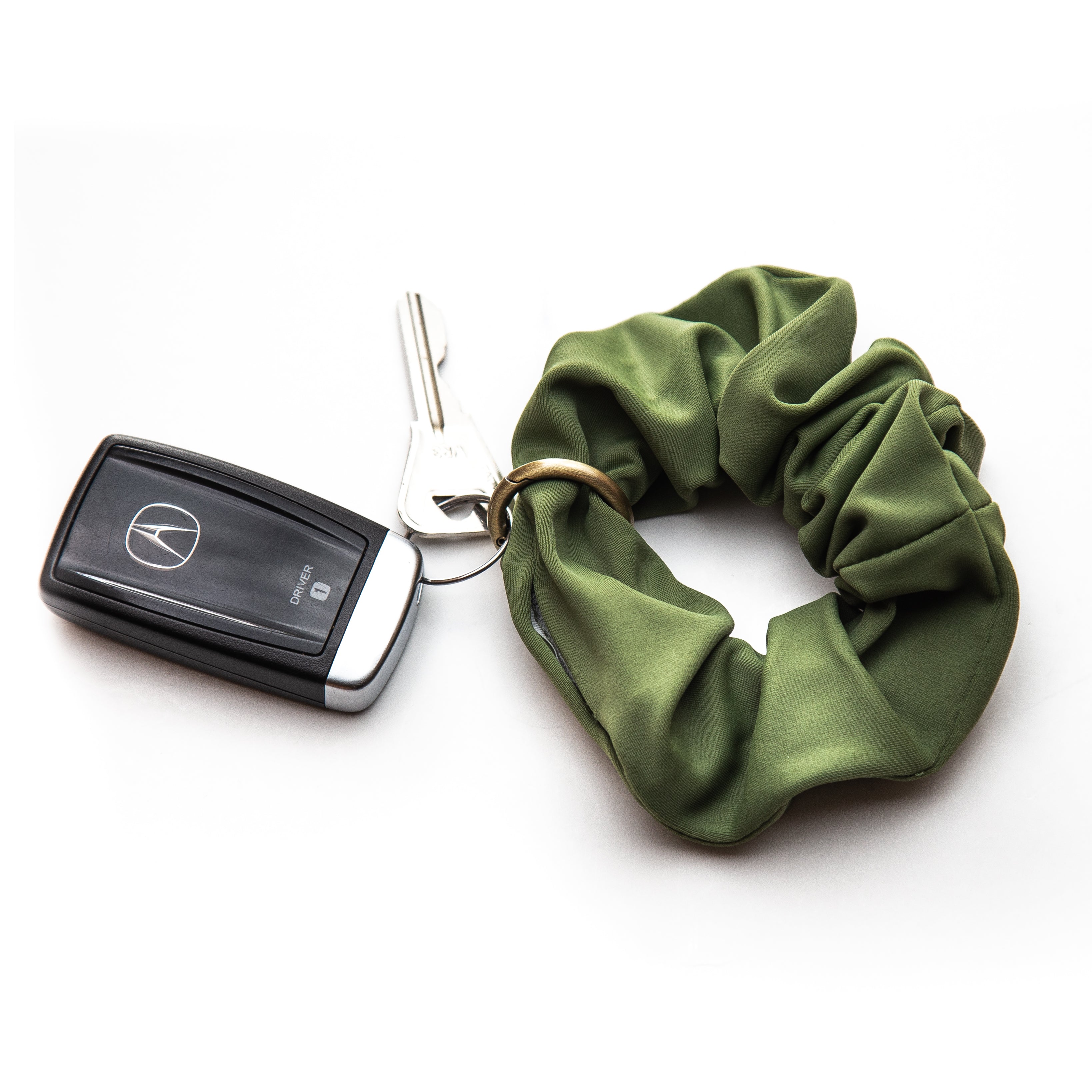 A multifunctional Scrunchie with a hidden velcro pocket that comes with a complimentary removable Key Ring. The pocket protects your little things (like a wedding ring, house key or cash) from being lost, stolen or damaged. It is the handiest hands-free keychain and a fantastic scrunchie for your hair. It is kink-free and easy on your hair for damage prevention.