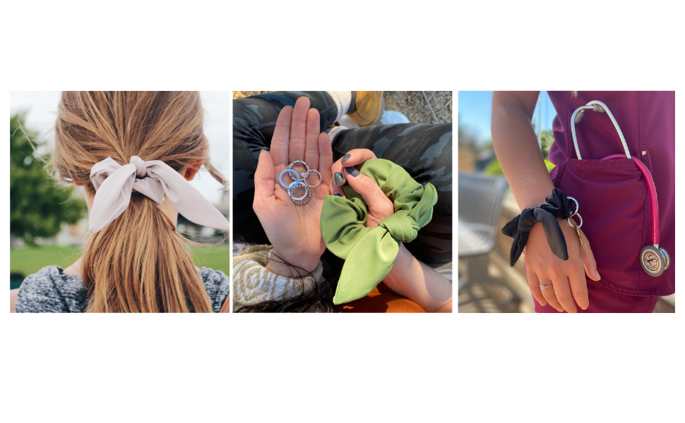 A multifunctional Scrunchie with a hidden velcro pocket that comes with a complimentary removable Key Ring. The pocket protects your little things (like a wedding ring, house key or cash) from being lost, stolen or damaged. It is the handiest hands-free keychain and a fantastic scrunchie for your hair. It is kink-free and easy on your hair for damage prevention.