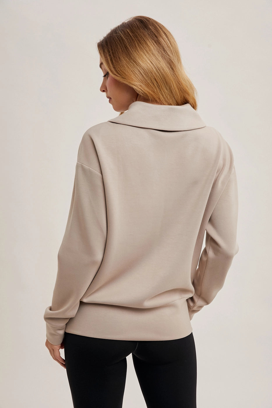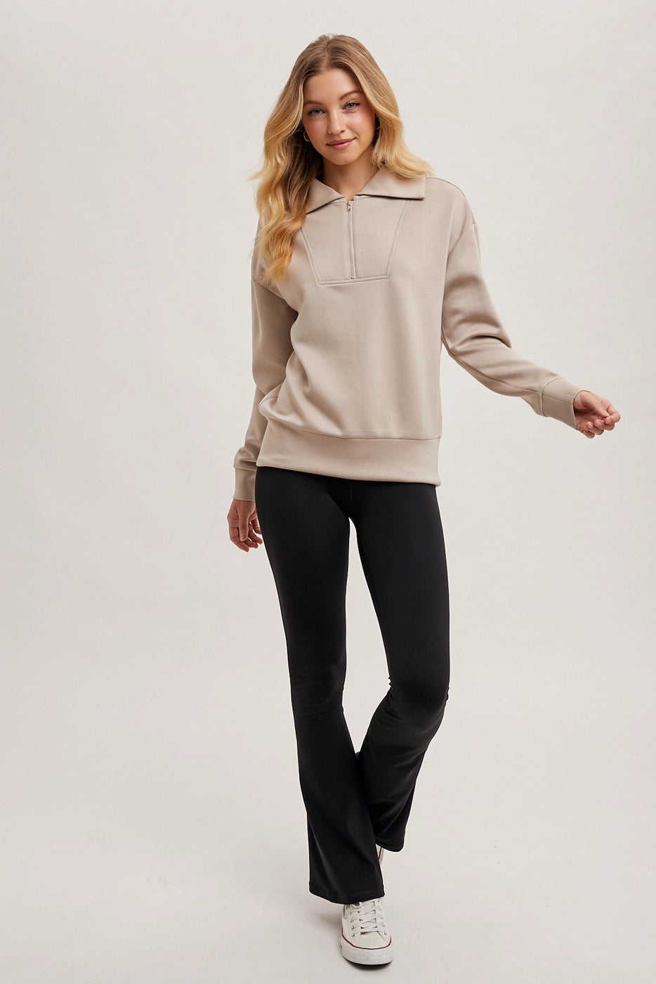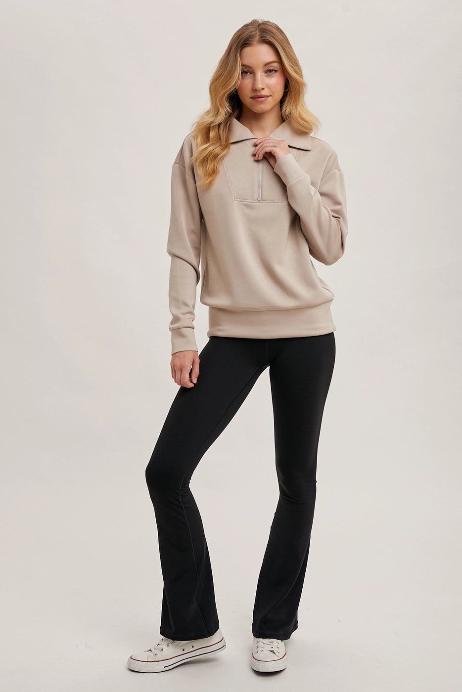 A half-zipper front knit sweatshirt is a cozy and functional piece, perfect for layering or wearing on its own. This sweatshirt is buttery soft! The half-zip design allows for adjustable ventilation and adds a sporty touch to the classic knit sweatshirt style. This sweatshirt typically features a relaxed fit, making it comfortable for everyday wear. We love the collar detail. It's versatile, pairing well with jeans, leggings, or even joggers, making it an ideal choice for casual outings or lounging at home. The knit fabric provides warmth, making it suitable for cooler weather.